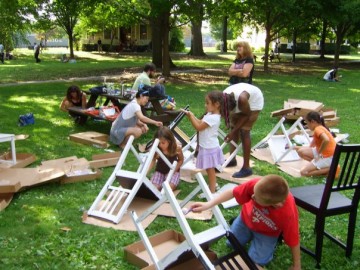 An industrial estate near the centre of The Hague is envisioned as an urban pig farm, reconnecting citizens with meat production and reacting upon the demands of the consumers to learn more about the origin of their food. The farm could provide energy for the surrounding buildings and the animals could live in good conditions without being subject to long distance transport for butchering. With modern technology preventing odor nuisance, the pig farm technically could have neighbors such as a Prada outlet or offices. Study, 2009 Chairs returned by Franck Bragigand posted November 10th, 2009 For one of the houses we asked Franck Bragigand to paint and furnish the inside in preparation for Open Talks that were to take place on the opening day. Franck has a great capacity to transform the world using only a coat of paint. He’ll cover anything, but never bring in something new. To seat the audience, used chairs were brought in from all over New York, and Franck had them painted by our team of volunteers.